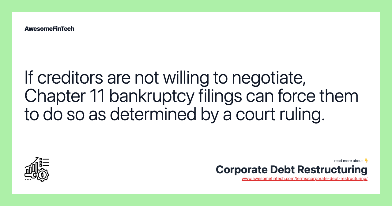 In the U.S., Chapter 11 proceedings allow for a company to get protection from creditors in the hopes of renegotiating the terms on the debt agreements and surviving as a going concern. Even if the creditors don't agree to the terms of a plan put forth, the court may determine that it is fair and impose the plan on creditors.