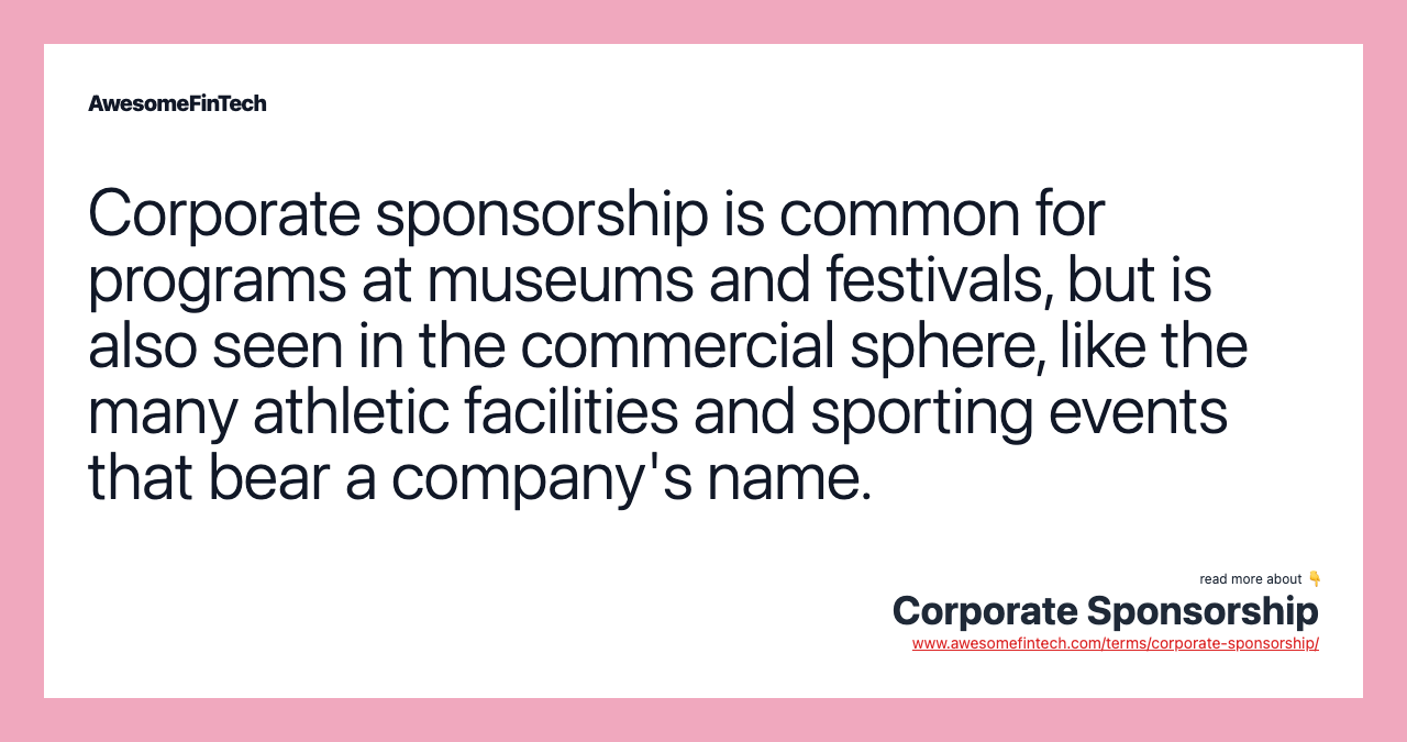 A corporate sponsorship is a form of marketing in which a company pays for the right to be associated with a project or program. A common template for corporate sponsorships entails a collaboration between a nonprofit organization and a sponsor corporation, in which the latter funds a project or program managed by the former in exchange for recognition.