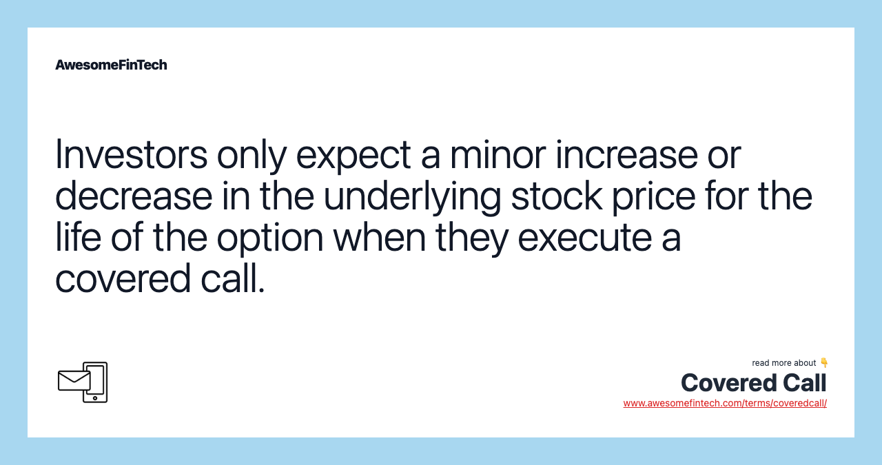 Covered calls are a neutral strategy, meaning the investor only expects a minor increase or decrease in the underlying stock price for the life of the written call option. This strategy is often employed when an investor has a short-term neutral view on the asset and for this reason, holds the asset long and simultaneously has a short position via the option to generate income from the option premium.