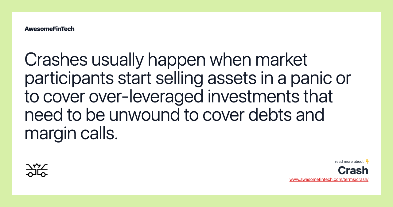 A crash can be caused by economic conditions, like the unwinding of too much leverage within a market, and by panic, which is when a market that is moving downward starts to induce fear in participants who want to sell at any cost. Some crashes, like the flash crash of 2010, are created by problems with the underlying mechanics of a market.