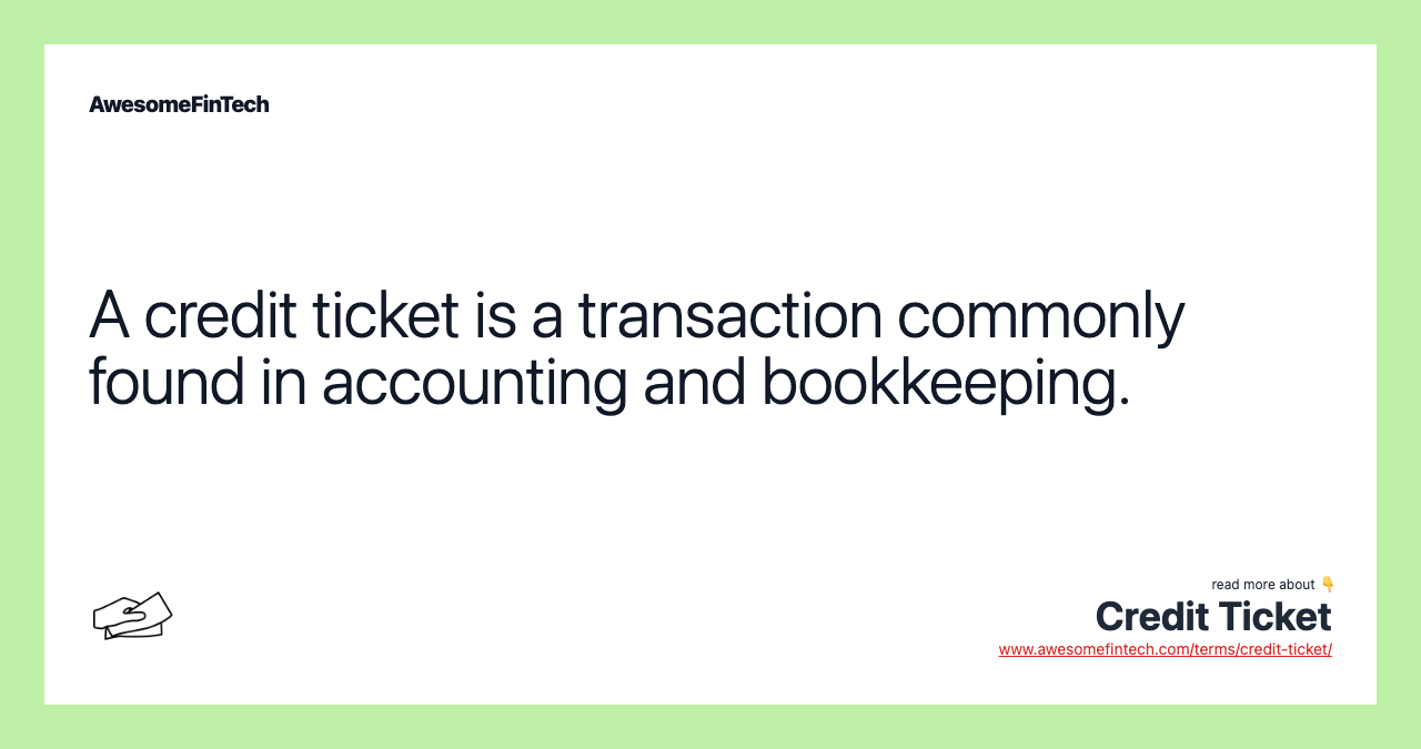 Table of Contents What Is a Credit Ticket? The term credit ticket refers to an accounting or bookkeeping transaction that generates a credit in the general ledger. In the past, credit tickets may have been produced as physical documents or paper tickets until the canceling debit ticket arrived to balance the books. Just like the credit ticket, the debit ticket is a placeholder placed on the general ledger. A credit ticket is an entry used in both accounting and bookkeeping that indicates money or assets that are received by a company or individual.