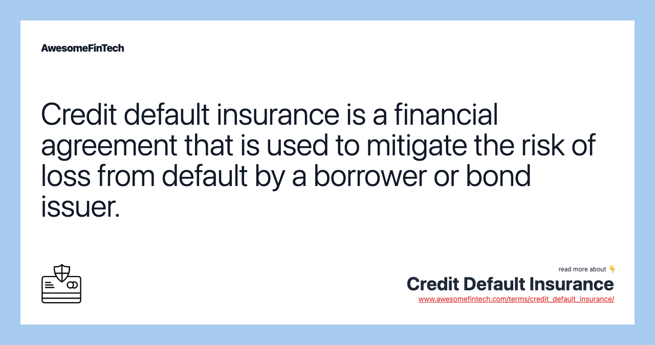 Credit default insurance is a financial agreement — usually a credit derivative such as a credit default swap (CDS) or a total return swap — to mitigate the risk of loss from default by a borrower or bond issuer.