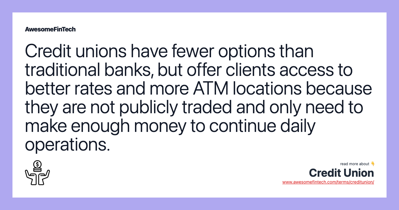 Table of Contents What Is a Credit Union? Credit unions have fewer options than traditional banks, but offer clients access to better rates and more ATM locations because they are not publicly traded and only need to make enough money to continue daily operations. However, credit unions have considerably fewer brick-and-mortar locations than most banks, which can be a drawback for clients who like in-person service. Credit unions are exempt from paying corporate income tax on their earnings. In this area, credit unions have two distinct advantages over banks, both resulting from their status as nonprofit organizations: 1. Credit unions are exempt from paying corporate income tax on earnings. 2. Credit unions need to generate only enough earnings to fund daily operations. Understanding a Credit Union Requirements for Membership Advantages of Credit Unions Disadvantages of Credit Unions Credit Unions vs. Banks Credit Union Insuran A credit union is a type of financial cooperative that provides traditional banking services. However, the NCUA, established in 1934, regulates federally chartered credit unions and most state-chartered credit unions. The Credit Union Locator can verify whether a credit union is federally chartered and other information.