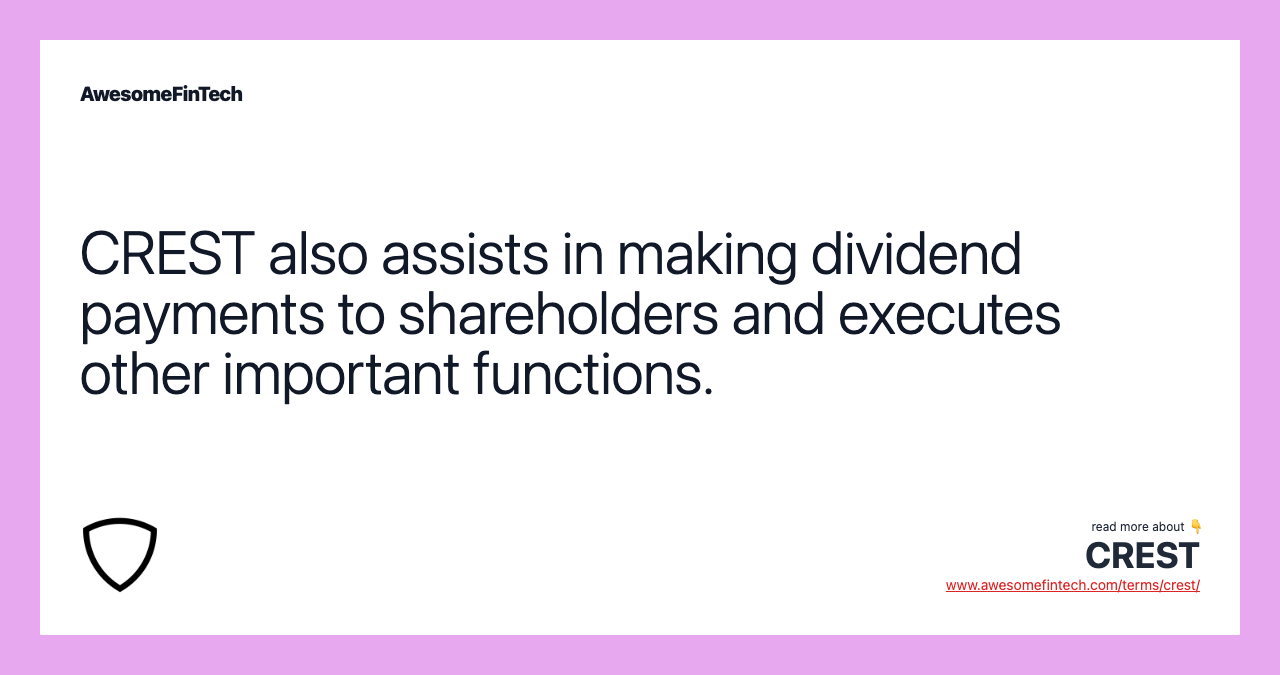 CREST makes it possible for bondholders and shareholders to keep assets in electronic form instead of holding physical share certificates. The system also assists in making dividend payments to shareholders and executes other important functions such as putting into effect corporate actions like rights issues.