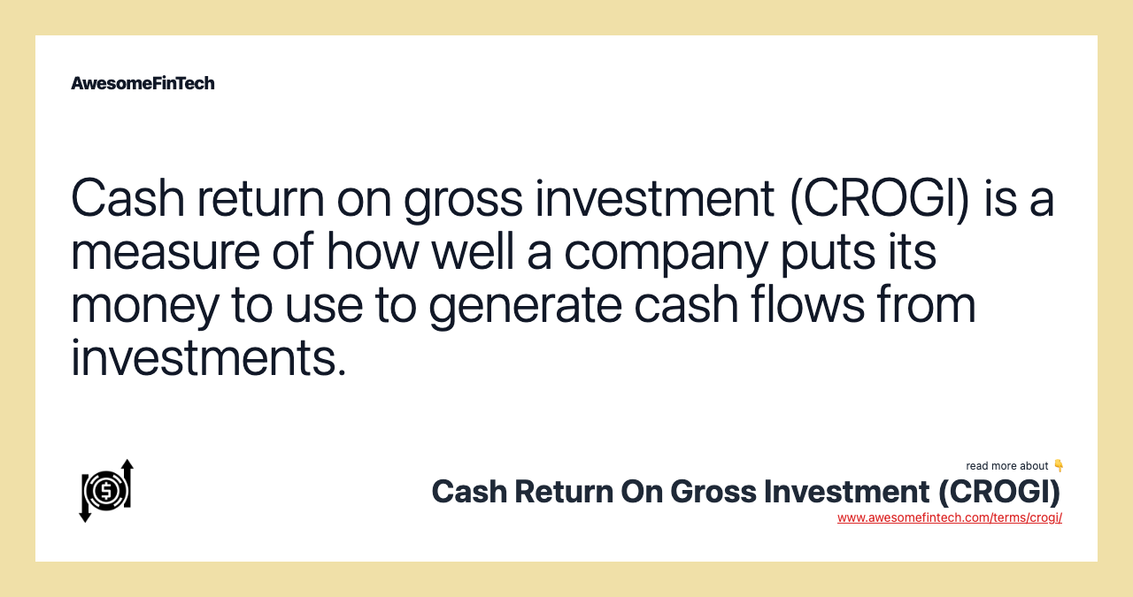 Cash Return On Gross Investment (CROGI) is a gauge of a company's financial performance that measures the cash flow a company generates with its invested capital. It is calculated as: > CROGI = gross cash flows / gross investment Gross cash flows are cash flows before taxes Note that CROGI and ROGIC calculations are used far less in practice than return on investment (ROI) analyses, since ROI is a metric that uses the net gains or losses generated on investment, relative to the total sum of money initially invested. Cash return on gross investment (CROGI) is a measure of how well a company puts its money to use to generate cash flows from investments. Other measurements include discounted free cash flow, economic value-added, enterprise value, return on capital employed (ROCE), and return on net assets (RONA), to name a few.
