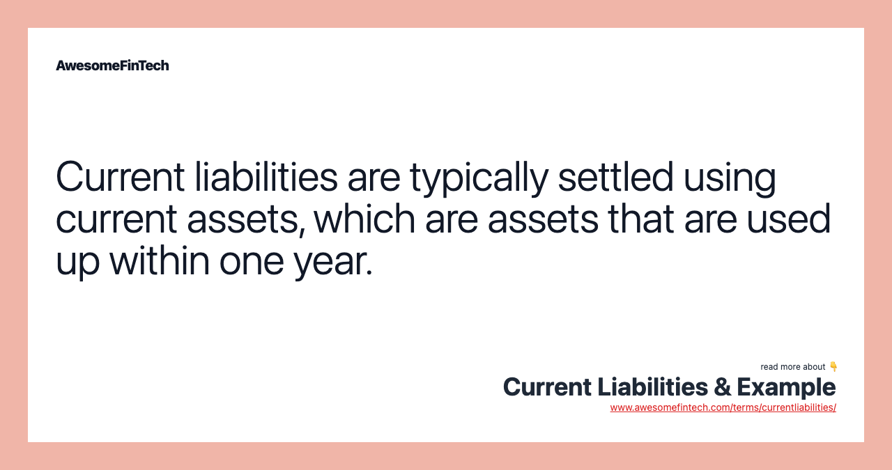 Current liabilities are typically settled using current assets, which are assets that are used up within one year. Current assets include cash or accounts receivables, which is money owed by customers for sales. The ratio of current assets to current liabilities is an important one in determining a company's ongoing ability to pay its debts as they are due.