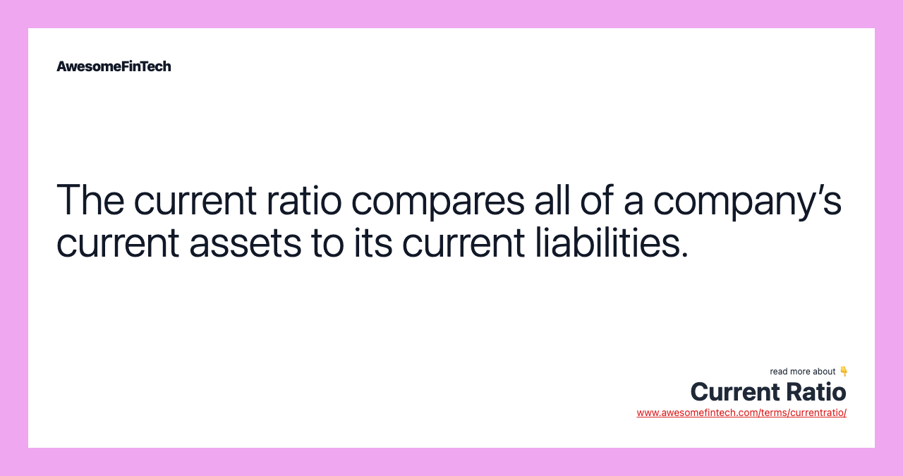 The current ratio measures a company's ability to pay current, or short-term, liabilities (debts and payables) with its current, or short-term, assets, such as cash, inventory, and receivables.