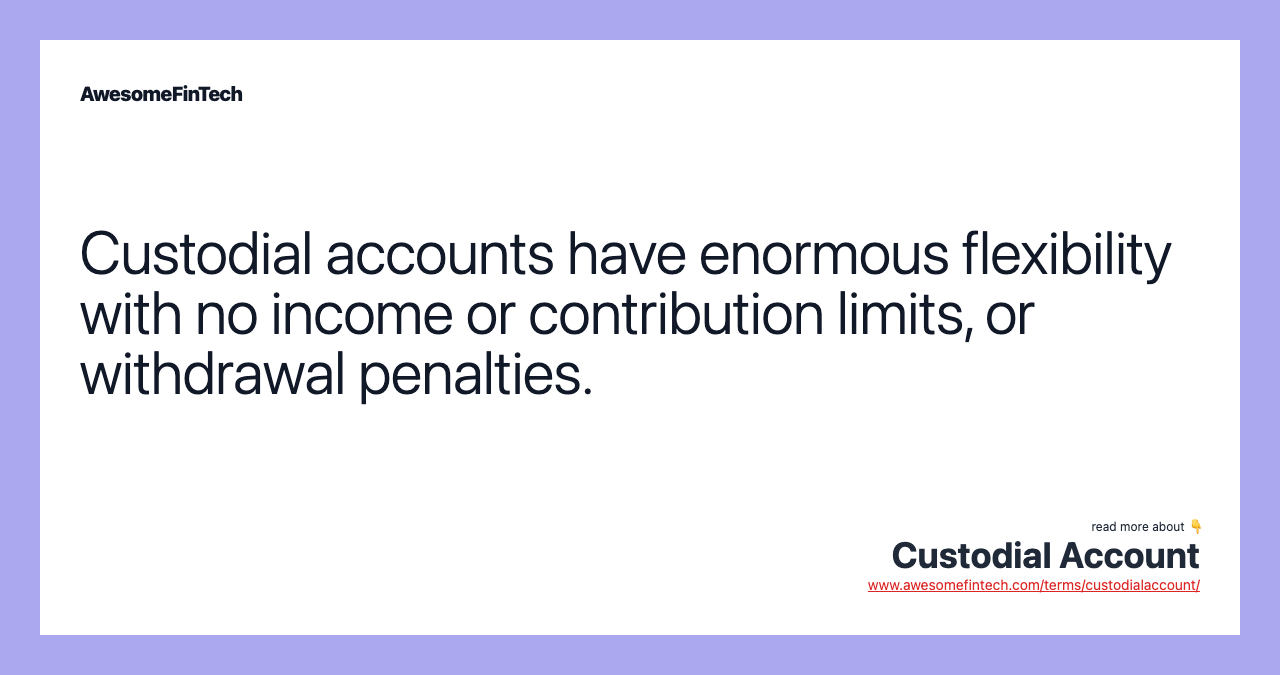 Custodial accounts have enormous flexibility. There are no income or contribution limits, and no requirements to make regular distributions at any point. Also, there are no withdrawal penalties.
