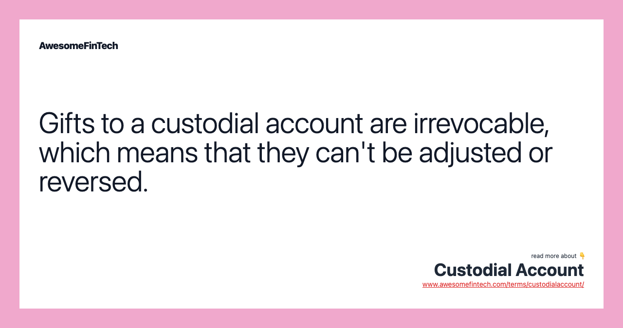 Any deposit or gifts made to the account is irrevocable, meaning it cannot be changed or reversed. All of the account's holdings pass, irrevocably, to the minor at the age of majority. In contrast, many college savings plans, such as a 529 account, allow parents to retain control of the funds.