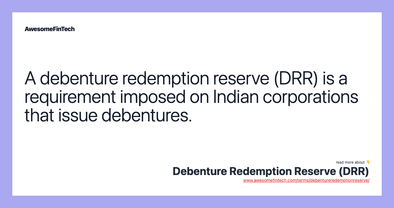 A debenture redemption reserve (DRR) is a provision stating that any Indian corporation that issues debentures must create a debenture redemption service in an effort to protect investors from the possibility of a company defaulting. This provision was added to the Indian Companies Act of 1956 in an amendment introduced in the year 2000.