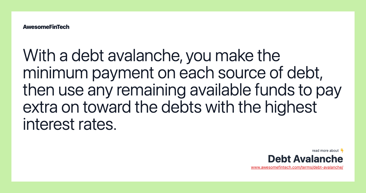 A debt avalanche is a type of accelerated debt repayment plan. Essentially, a debtor allocates enough money to make the minimum payment on each source of debt, then devotes any remaining repayment funds to the debt with the highest interest rate. Using the debt avalanche approach, once the debt with the highest interest rate is entirely paid off, then the extra repayment funds go toward the next-highest interest-bearing loan. This system continues until all the debts are paid off.