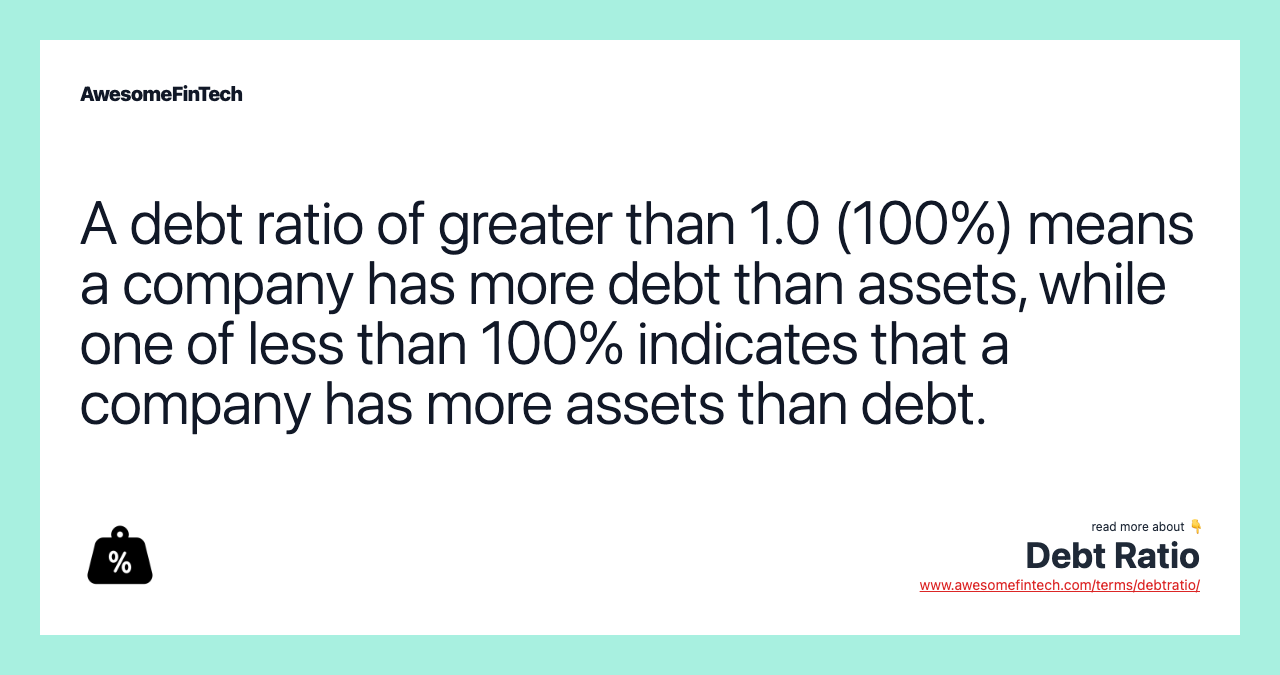 A debt ratio greater than 1.0 (100%) tells you that a company has more debt than assets. Meanwhile, a debt ratio of less than 100% indicates that a company has more assets than debt. Used in conjunction with other measures of financial health, the debt ratio can help investors determine a company's risk level.