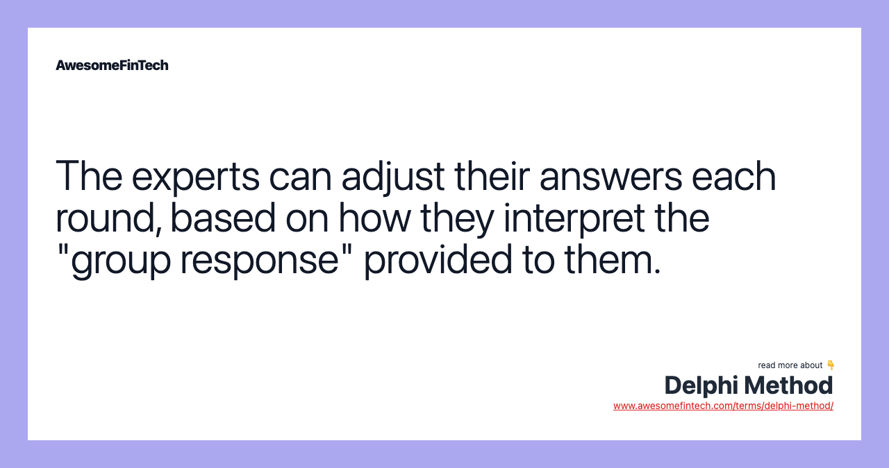 Several rounds of questionnaires are sent out to the group of experts, and the anonymous responses are aggregated and shared with the group after each round. The experts are allowed to adjust their answers in subsequent rounds, based on how they interpret the "group response" that has been provided to them. Since multiple rounds of questions are asked and the panel is told what the group thinks as a whole, the Delphi method seeks to reach the correct response through consensus.
