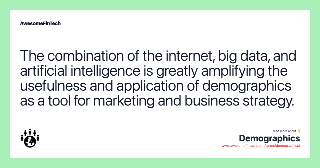 Demographics are key to businesses today. They help identify the individual members of an audience by selecting key characteristics, wants, and needs. This allows companies to tailor their efforts based on particular segments of their customer base. Online advertising and marketing have made enormous headway over the past decade in using algorithms and big data analysis to micro-target ads on social media to very specific demographics.