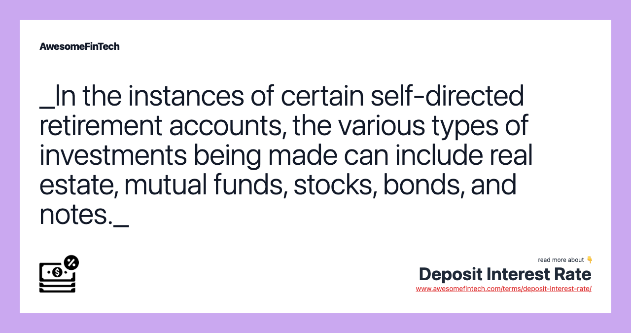 In the instances of certain self-directed retirement accounts, the various types of investments being made can include real estate, mutual funds, stocks, bonds, and notes.