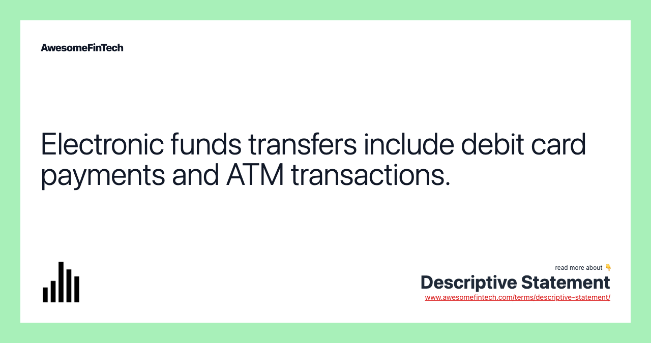 A descriptive statement is a bank statement that lists deposits, withdrawals, service fees, and other such transactions in chronological order. Specific examples of an EFT under Regulation E include debit card and automated teller machine (ATM) transactions, as well as automated clearing house (ACH) and non-operator-assisted telephone transfers. As noted above, a descriptive statement will list the account holder's debit card and automated teller machine transactions, as well as automated clearing house and non-operator-assisted telephone transfers. Separately, the CFPB also has authority over credit card statements, as a result of the Credit Card Accountability, Responsibility and Disclosure Act of 2009, also known as the CARD Act. Much of Regulation E outlines the procedures that consumers are required to follow when they report errors in regard to EFTs, along with the steps that banks must take to investigate complaints and resolve them. **Non-operator-assisted telephone transfers** would include utility bill payments or other transactions where the account holder punches in a code to authorize the withdrawal of money from their bank account via telephone.