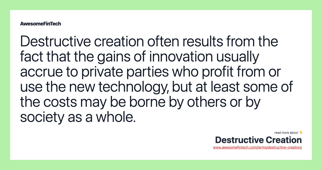 Table of Contents What Is Destructive Creation? Destructive creation is a term used to describe when the introduction of new technology, new products, or new processes happens in a way that produces more damage to existing industries or consumption patterns than the total benefit of the newly introduced innovation. In destructive creation, the cost of the industries, jobs, and investment opportunities destroyed (plus any other unintended consequences to the economy, society, or environment) appear to outweigh the benefits of a new product or technology. In contrast, destructive creation is when innovation leads to negative, net social and economic outcomes, though it might still benefit the originator or end-users of the new innovation. Destructive creation often results from the fact that the gains of innovation usually accrue to private parties who profit from or use the new technology, but at least some of the costs may be borne by others or by society as a whole.