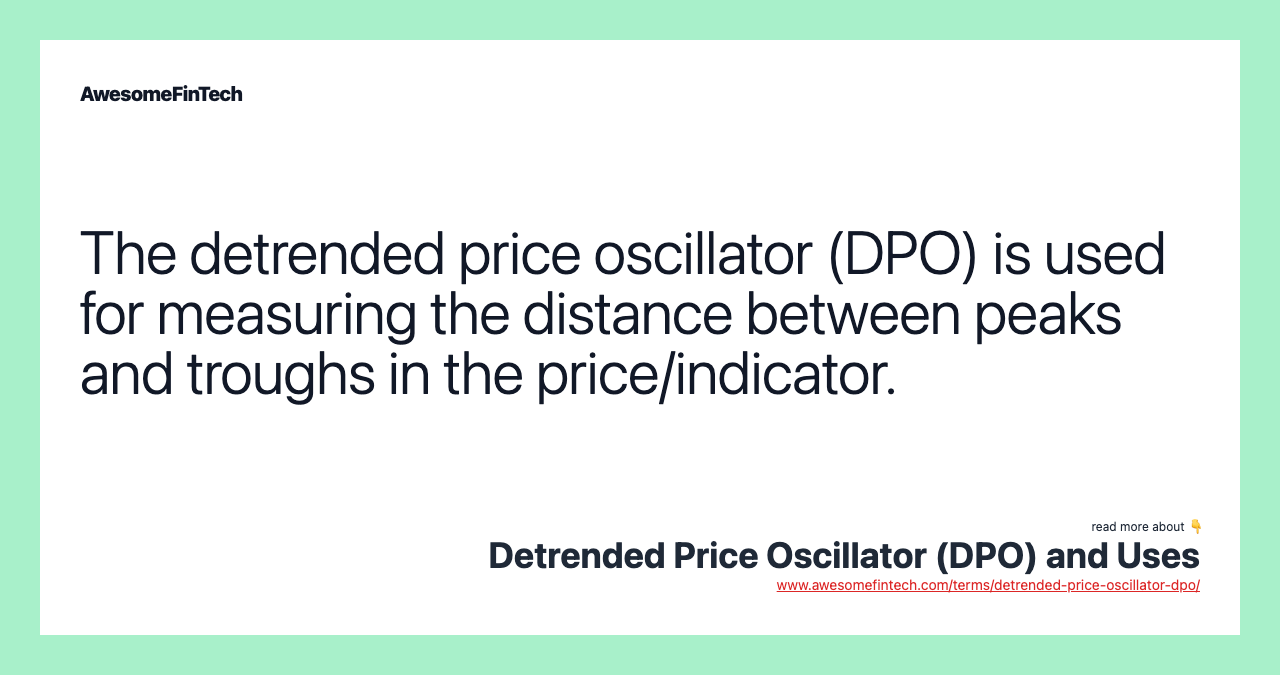 A detrended price oscillator, used in technical analysis, strips out price trends in an effort to estimate the length of price cycles from peak to peak or trough to trough. The indicator is typically set to look back over 20 to 30 periods. D P O \= P r i c e f r o m X 2 \+ 1 p e r i o d s a g o − X p e r i o d S M A where: X = Number of periods used for the look-back period SMA = Simple Moving Average \\begin{aligned} &DPO=Price~from~\\frac{X}{2}+1~periods~ago-X~period~SMA\\\\ &\\textbf{where:}\\\\ &\\text{X = Number of periods used for the look-back period}\\\\ &\\text{SMA = Simple Moving Average}\\\\ \\end{aligned} DPO\=Price from 2X+1 periods ago−X period SMAwhere:X = Number of periods used for the look-back periodSMA = Simple Moving Average 1. Determine a lookback period, such as 20 periods. 2. Find the closing price from x/2 +1 periods ago. 4. Subtract the SMA value (step 3) from the closing price x/2 +1 periods ago (step 2) to get the DPO value. The detrended price oscillator seeks to help a trader identify an asset's price cycle. To further aid with trade timing, the distance between a trough and peak could be used to estimate the length of a long trade, or the distance between a peak and a trough to estimate the length of a short trade. When the price from x/2+1 periods ago is above the SMA the indicator is positive. A detrended price oscillator, used in technical analysis, strips out price trends in an effort to estimate the length of price cycles from peak to peak or trough to trough.