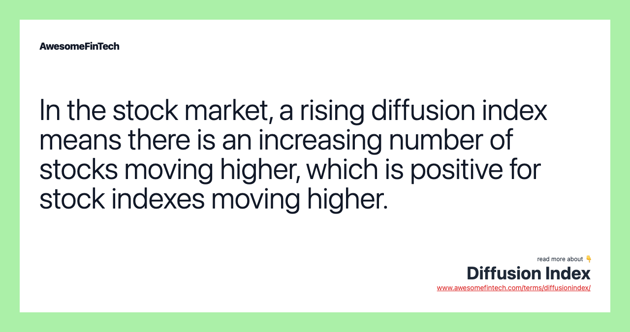 Used in technical analysis, a diffusion index measures the number of stocks that have advanced in price or are showing positive momentum. It is useful for determining the underlying strength of the stock market overall, as lots of stocks advancing show a strong market, while few(er) stocks advancing show a weaker market. In the stock market, the diffusion index is usually measured from day to day. Advancing stocks are those that moved up from the prior closing price.