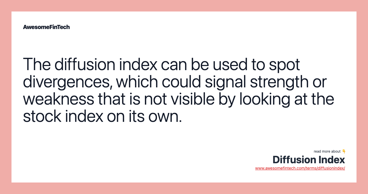 Table of Contents What Is a Diffusion Index? Understanding the Diffusion Index Special Considerations Diffusion Index vs. Tick Index Limitation The diffusion index can be used to spot divergences, which could signal strength or weakness that is not visible by looking at the stock index on its own. Diffusion Index (DI) \= ( Advances − Declines ) \+ PDIV where: Advances \= Number of stocks moving higher Declines \= Number of stocks moving lower PDIV \= Previous DI value \\begin{aligned} &\\text{Diffusion Index (DI)} = ( \\text{Advances} - \\text{Declines} ) + \\text{PDIV} \\\\ &\\textbf{where:}\\\\ &\\text{Advances} = \\text{Number of stocks moving higher} \\\\ &\\text{Declines} = \\text{Number of stocks moving lower} \\\\ &\\text{PDIV} = \\text{Previous DI value} \\\\ \\end{aligned} Diffusion Index (DI)\=(Advances−Declines)+PDIVwhere:Advances\=Number of stocks moving higherDeclines\=Number of stocks moving lowerPDIV\=Previous DI value The diffusion index, also known as the advance/decline index, is one of many different forecasting tools used by technical analysts to signal when the market is bullish or bearish. Generally, if the diffusion index is rising with a stock index, that helps confirm that the uptrend within the stock index is strong, as an increasing number of stocks are moving higher. It means fewer stocks are advancing, which makes sense since the stock index is declining (and the stocks within the stock index are declining). In the stock market, a rising diffusion index means there is an increasing number of stocks moving higher, which is positive for stock indexes moving higher.