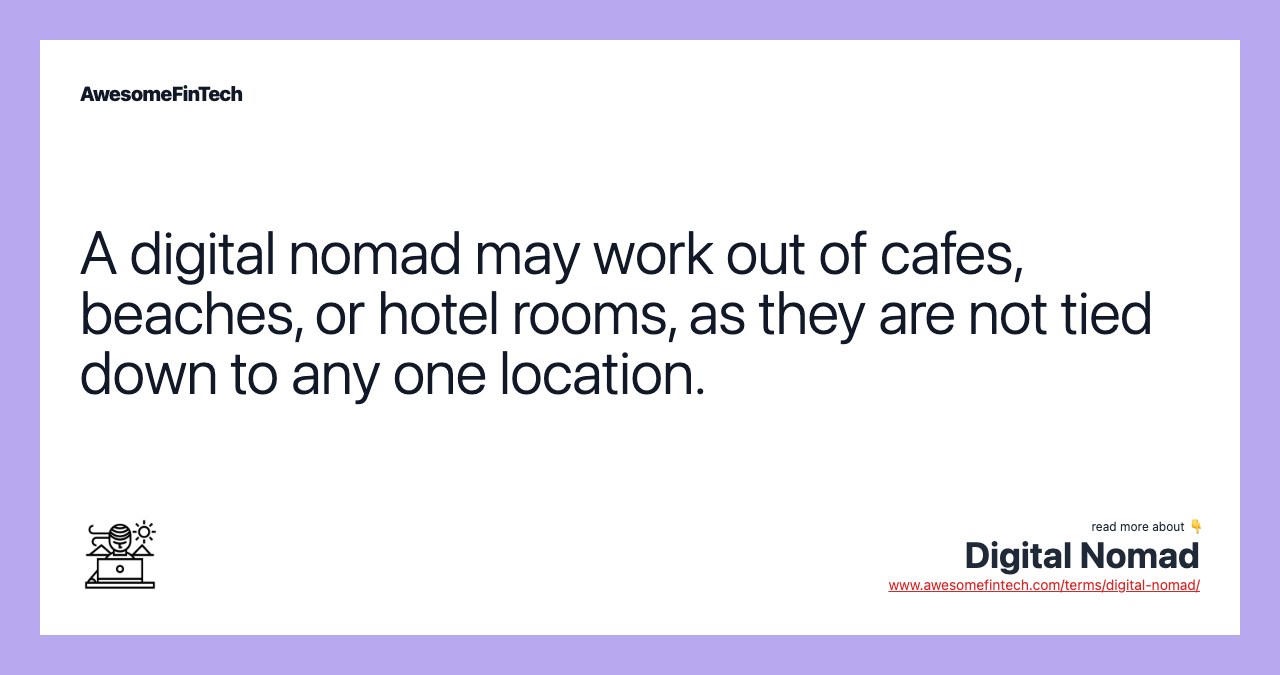 Table of Contents What Is a Digital Nomad? Understanding Digital Nomads Who Are the Digital Nomads? When Digital Nomads Settle Down Pros and Cons of Digital Nomads Examples of Digital Nomads Digital Nomads FAQs The Bottom Line Digital nomads are people who are location-independent and use technology to perform their job, living a nomadic lifestyle. Some digital nomads have a wide range of clients and make a living through the combination of jobs, while others have formal or semi-formal agreements with clients guaranteeing a certain amount of work or billable hours. Outsite is an online community of digital nomads that provides access to coliving/coworking, plus offers services to support remote workers. A digital nomad isn't a specific job that earns a salary, so what you earn as a digital nomad depends on the type of work you do, like working from home versus in an office. While it may be difficult to count every single remote worker living a digital nomad lifestyle, according to MBO Partners, there are approximately 10.9 million digital workers in the U.S., as of 2020, the most recent statistics available.