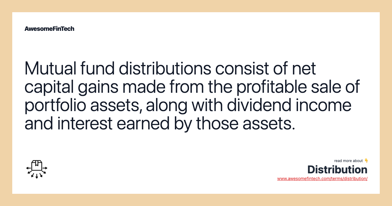 Table of Contents What Is Distribution? Understanding Distributions Distributions From Mutual Funds Stock and Bond Distributions Investment Trust Distributions Retirement Account Distributions Required Distributions From Retirement Plans However, the term is used most commonly to describe the following situations: 1. When a mutual fund distributes capital gains, dividend, or interest income to fund owners 2. When a publically traded company distributes interest or returns capital to shareholders 3. When a retirement account owner takes distributions in the form of taxable income A capital gains distribution is a cash payment made by a mutual fund or exchange-traded fund (ETF) to fund owners. After the account has been in existence for a certain number of years, account holders may withdraw funds early but will pay penalty fees if they withdraw a sum greater than their contributions — if the distribution includes the account's earnings, in other words. With mutual funds, distributions represent the allocation of capital gains and dividend or interest income generated by the fund for the investors periodically during a calendar year.
