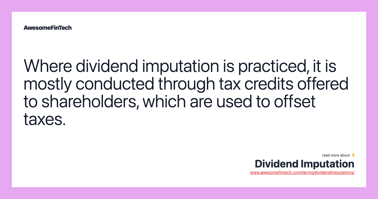 Dividend imputation is a tax policy used in Australia and several other countries that eliminates the double taxation of cash payouts from a corporation to its shareholders. Through the use of tax credits called franking credits or imputed tax credits, the tax authorities are notified that a company has already paid the required income tax on the income it distributes as dividends. The shareholder does not then owe taxes on the dividend income. Many prominent countries used to practice dividend imputation but have since stopped the practice, such as the United Kingdom and Germany Where dividend imputation is practiced, it is mostly conducted through tax credits offered to shareholders, which are used to offset taxes. These countries include the following: United Kingdom The United Kingdom and Ireland, for example, previously offered partial imputation with tax credits that effectively reduced taxation on the dividends by 12.5% to 25%. Dividend imputation is a tax policy used in Australia and several other countries that eliminates the double taxation of cash payouts from a corporation to its shareholders.
