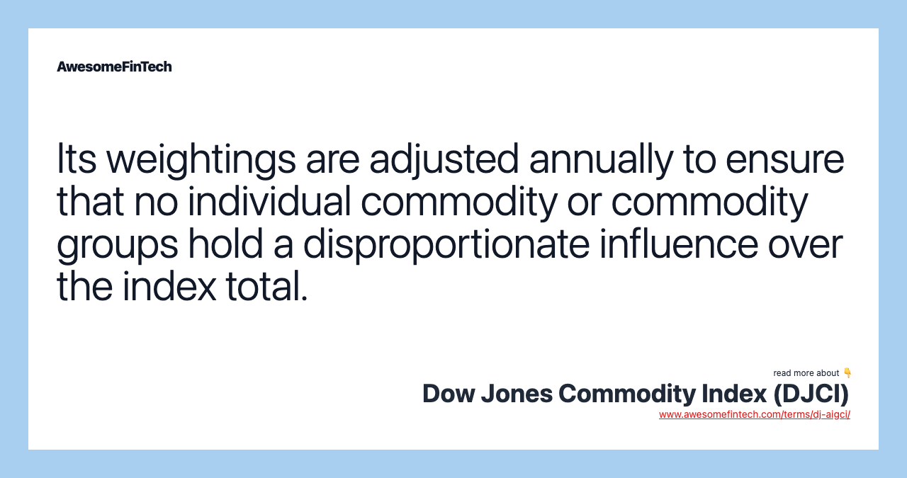 The Dow Jones Commodity Index (DJCI) is a weighted index that tracks a wide range of 28 different commodity futures contracts, including metals, agricultural products, and energy commodities such as oil and gas. The Dow Jones Commodity Index (DJCI) is a weighted index that tracks a wide range of 28 different commodity futures contracts, including metals, agricultural products, and energy commodities such as oil and gas. The Dow Jones Commodity Index (DJCI) is a broad measure of the commodity futures market that emphasizes diversification and liquidity through a simple, straightforward, equal-weighted approach. The commodity index was initially created by American International Group (AIG) in 1998, in an effort to meet the then-growing market demand for distinct market indices focused on alternative assets. The contracts represented by the index are weighted based on commodity production levels and the liquidity of the underlying contracts.