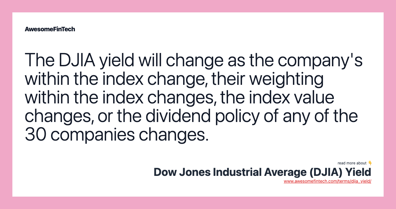 The Dow Jones Industrial Average (DJIA) yield is the aggregate dividend yield on the 30 stocks that make up the Dow Jones Industrial Average (DJIA). The yield will fluctuate as dividends are increased or decreased by the companies within the index, as companies within the index change, as weightings within the index change, and also as the price of the ETF or index changes since a stock's yield is calculated by dividing dividends paid by price. Between 1999 and 2009, the Dow dividend yield has fluctuated from just above 1% in late 1999 to above 4% in early 2009. Between 2010 and early 2020, the yield stayed largely between 2% and 3%. When the index moves down substantially, as it did in 2008 and early 2009, this tends to drive up the dividend yield. The DJIA yield will change as the company's within the index change, their weighting within the index changes, the index value changes, or the dividend policy of any of the 30 companies changes. The Dow Jones Industrial Average (DJIA) yield is the aggregate dividend yield on the 30 stocks that make up the Dow Jones Industrial Average (DJIA).