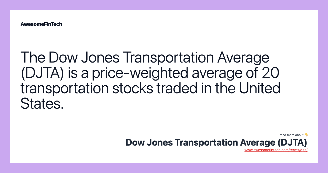 The Dow Jones Transportation Average (DJTA), sometimes simply known as the "Dow Transports" is a price-weighted average of 20 transportation stocks traded in the United States. The Dow Jones Transportation Average is the oldest U.S. stock index, first compiled in 1884 by Charles Dow, co-founder of Dow Jones & Company.