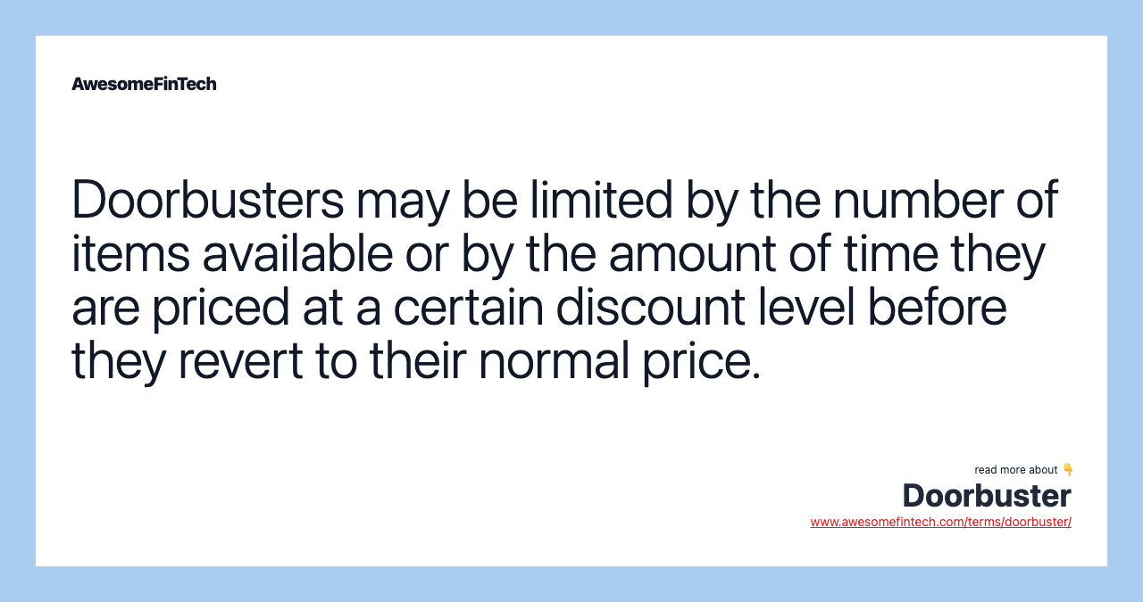 A doorbuster is a marketing and sales strategy retailers use to get a high volume of customers into their stores during opening hours. During a doorbuster sale, a particular item or a selection of items is offered at a special discount price for a limited time. The aim is to get customers in the door or "bust open the doors" to buy the merchandise and look at other items for sale.