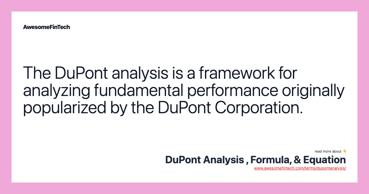 The DuPont analysis (also known as the DuPont identity or DuPont model) is a framework for analyzing fundamental performance popularized by the DuPont Corporation. DuPont Analysis \= Net Profit Margin × AT × EM where: Net Profit Margin \= Net Income Revenue AT \= Asset turnover Asset Turnover \= Sales Average Total Assets EM \= Equity multiplier Equity Multiplier \= Average Total Assets Average Shareholders’ Equity \\begin{aligned} &\\text{DuPont Analysis} = \\text{Net Profit Margin} \\times \\text{AT} \\times \\text{EM} \\\\ &\\textbf{where:}\\\\ &\\text{Net Profit Margin} = \\frac{ \\text{Net Income} }{ \\text{Revenue} } \\\\ &\\text{AT} = \\text{Asset turnover} \\\\ &\\text{Asset Turnover} = \\frac{ \\text{Sales} }{ \\text{Average Total Assets} } \\\\ &\\text{EM} = \\text{Equity multiplier} \\\\ &\\text{Equity Multiplier} = \\frac{ \\text{Average Total Assets} }{ \\text{Average Shareholders' Equity} } \\\\ \\end{aligned} DuPont Analysis\=Net Profit Margin×AT×EMwhere:Net Profit Margin\=RevenueNet IncomeAT\=Asset turnoverAsset Turnover\=Average Total AssetsSalesEM\=Equity multiplierEquity Multiplier\=Average Shareholders’ EquityAverage Total Assets 1:41 The accounts used to calculate financial leverage are both on the balance sheet, so analysts will divide average assets by average equity rather than the balance at the end of the period, as follows: Financial Leverage \= Average Assets Average Equity \= $ 1 , 0 0 0 $ 2 5 0 \= 4 \\begin{aligned} &\\text{Financial Leverage} = \\frac{ \\text{Average Assets} }{ \\text{Average Equity} } = \\frac{ \\$1,000 }{ \\$250 } = 4 \\\\ \\end{aligned} Financial Leverage\=Average EquityAverage Assets\=$250$1,000\=4 Most companies should use debt with equity to fund operations and growth. That means the owner's profit margin is 15%, which can be calculated as follows: Profit Margin \= Net Income Revenue \= $ 0 . 1 5 $ 1 . 0 0 \= 1 5 % \\begin{aligned} &\\text{Profit Margin} = \\frac{ \\text{Net Income} }{ \\text{Revenue} } = \\frac{ \\$0.15 }{ \\$1.00 } = 15\\% \\\\ \\end{aligned} Profit Margin\=RevenueNet Income\=$1.00$0.15\=15% The profit margin can be improved if costs for the owner were reduced or if prices were raised, which can have a large impact on ROE. The Dupont analysis is an expanded return on equity formula, calculated by multiplying the net profit margin by the asset turnover by the equity multiplier.