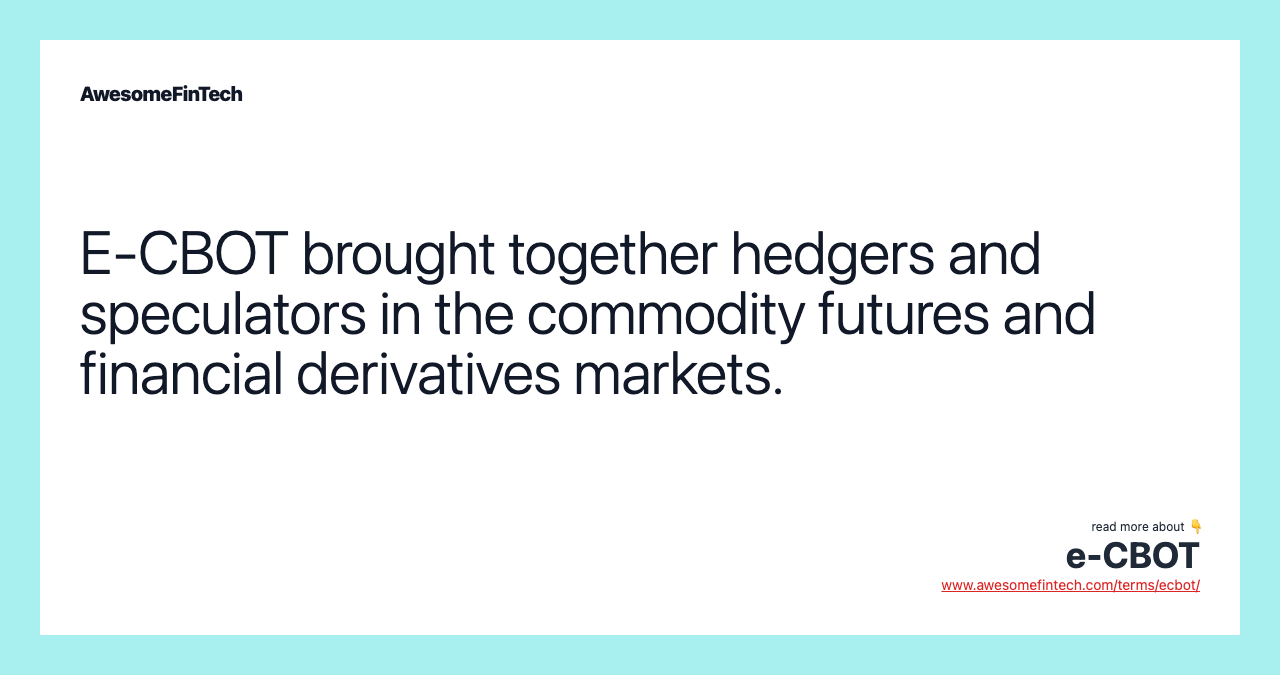 E-CBOT was an electronic trading platform operated by the Chicago Board of Trade (CBOT). It was primarily used by traders wishing to speculate and hedge against risks in the commodity futures and financial derivatives markets. When the Chicago Mercantile Exchange (CME) bought the CBOT, e-CBOT was rolled into CME's electronic trading platform, Globex. As such, e-CBOT no longer exists.
