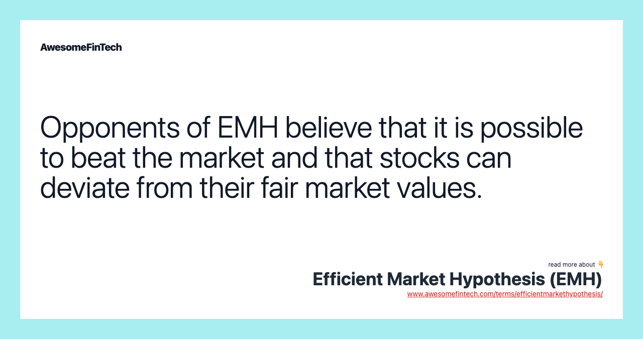 The efficient market hypothesis (EMH), alternatively known as the efficient market theory, is a hypothesis that states that share prices reflect all information and consistent alpha generation is impossible. The efficient market hypothesis (EMH), alternatively known as the efficient market theory, is a hypothesis that states that share prices reflect all information and consistent alpha generation is impossible. However, modifications of EMH exist to reflect the degree to which it can be applied to markets: Semi-strong efficiency - This form of EMH implies all public (but not non-public) information is calculated into a stock's current share price. EMH proponents, however, argue that those who outperform the market do so not out of skill but out of luck, due to the laws of probability: at any given time in a market with a large number of actors, some will outperform the mean, while others will underperform. Detractors of the EMH also point to events such as the 1987 stock market crash, when the Dow Jones Industrial Average (DJIA) fell by over 20 percent in a single day, and asset bubbles as evidence that stock prices can seriously deviate from their fair values.