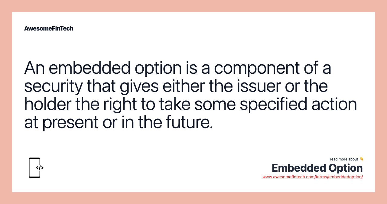 An embedded option is a feature of a financial instrument that lets issuers or holders take specified actions against the other party at some future time. Embedded options are provisions included in some fixed-income securities that allow investors or the issuer to do specific actions, such as call back (redeem) the issue early.