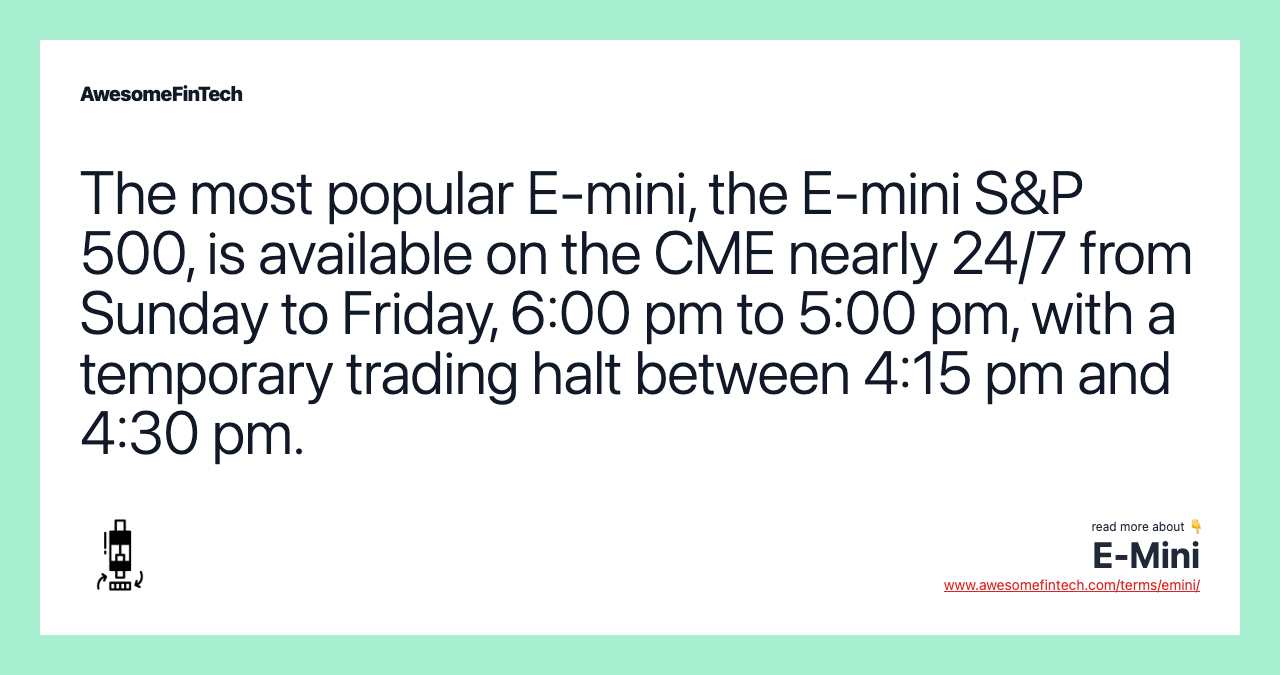 Furthermore, this means that a .25 change in S&P 500 index points has a monetary value of $12.50. Trading on the E-mini S&P 500, which has the Globex ticker ES, is available on the CME nearly 24/7 from Sunday to Friday, 6:00 pm to 5:00 pm, with a temporary trading halt between 4:15 pm and 4:30 pm. There are quarterly contracts (Mar., Jun., Sept., Dec.) listed for 5 consecutive quarters.