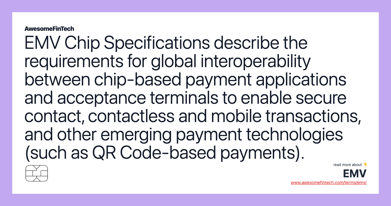 EMV® Chip started as a jointly developed global standard that allows interoperability between the cards with computer chips and terminals used by the largest financial services companies. EMV Specifications for card-not-present payments include EMV 3-D Secure (EMV 3DS), EMV Secure Remote Commerce (EMV SRC) , and EMV Payment Tokenisation. While the EMV Chip Specifications reduce the chance of fraud and nullify counterfeit cards for card-present transactions at point of sale terminals, they are limited in protecting card-not-present transactions. There are now nearly ten billion EMV Chip payment cards worldwide and 83.1% of all card-present transactions conducted globally used EMV Chip technology. EMV Chip Specifications describe the requirements for global interoperability between chip-based payment applications and acceptance terminals to enable secure contact, contactless and mobile transactions, and other emerging payment technologies (such as QR Code-based payments).