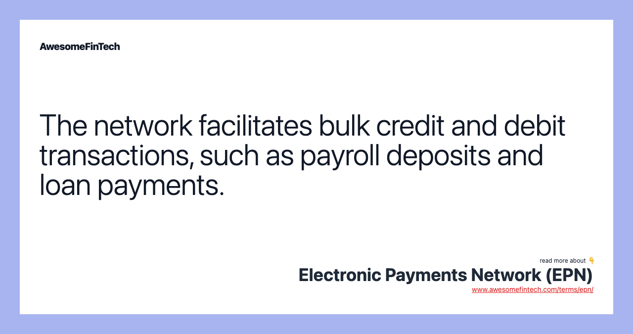 The term Electronic Payments Network (EPN) refers to a financial clearinghouse that handles a variety of electronic funds transfers for the private sector. It is one of the automated clearinghouses (ACHs) in the United States, along with the Reserve Banks. Funds are transferred using the EPN between accounts at the same or different financial institutions. Examples of transfers under the EPN include deposits for payroll, Social Security benefits, and tax refunds, as well as debit transfers like loan payments and insurance premiums.