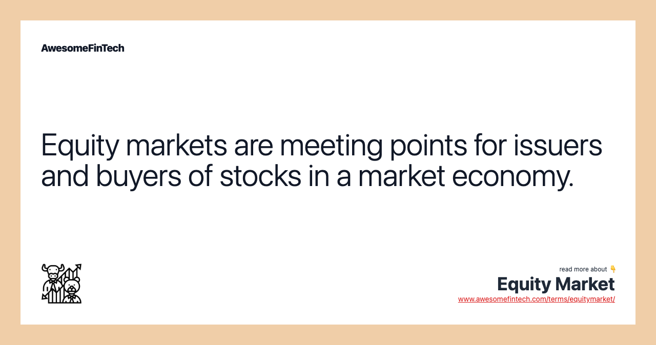An equity market is a market in which shares of companies are issued and traded, either through exchanges or over-the-counter markets. Also known as the stock market, it is one of the most vital areas of a market economy. It gives companies access to capital to grow their business, and investors a piece of ownership in a company with the potential to realize gains in their investment based on the company's future performance.