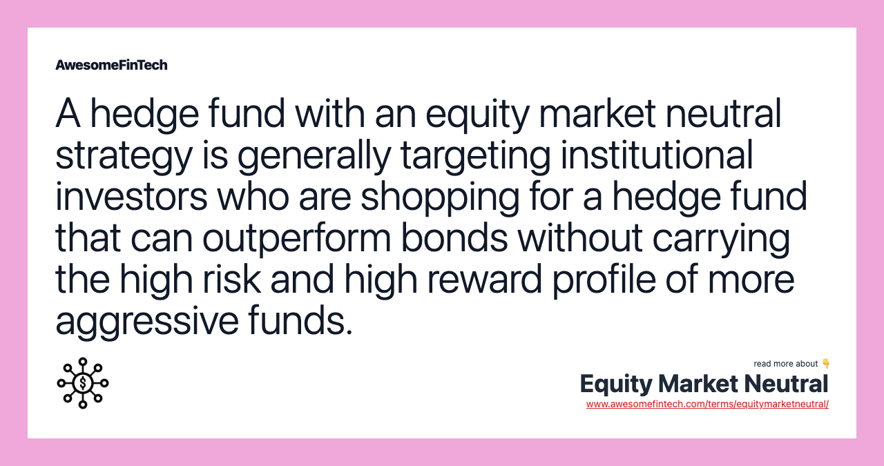 A hedge fund with an equity market neutral strategy is generally aiming itself at institutional investors who are shopping for a hedge fund that can outperform bonds without carrying the high risk and high reward profile of more aggressive funds. Due to this emphasis on low risk, equity market neutral funds tend to have lower returns than other hedge funds. It is interesting to note that equity market neutral funds can and do lose money on an annual basis, but it is not usually a significant amount. So institutional investors in equity market neutral funds know they can avoid double digit losses it they come to terms with the fact that double digit returns will be just as rare.