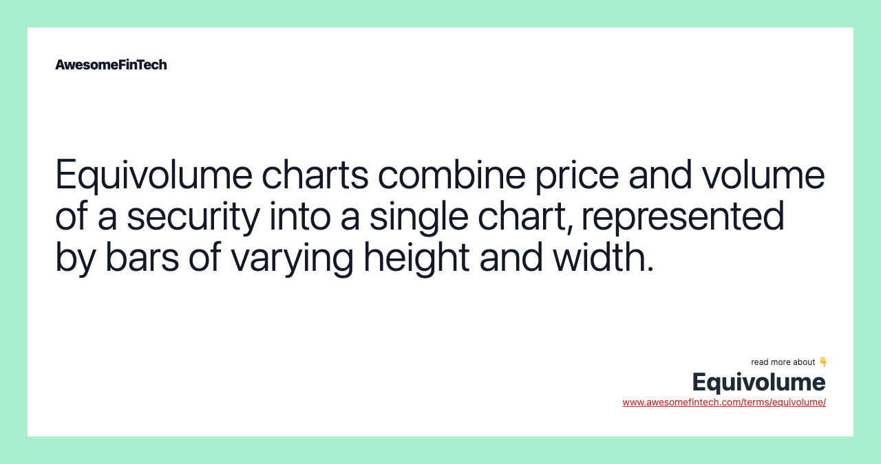 Equivolume is a technical chart that shows the price ranges of a security, such as a stock, and its trading volumes and plots them together as one piece of data. It is a tool in a technical analyst's toolbox that aids in their analysis of a security's viability as an investment.