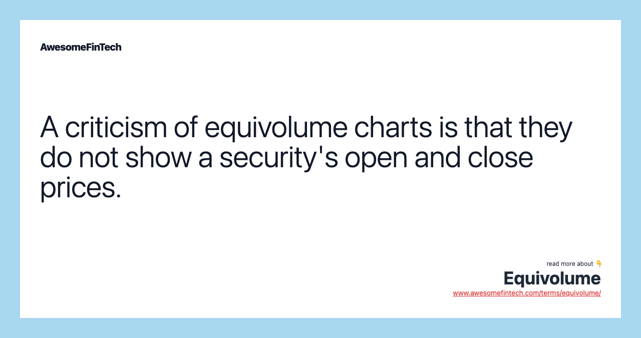 No single technical chart is foolproof, of course, so a trader who uses an equivolume chart should turn to other tools to help guide their trading. Also, an equivolume chart, unlike a candlestick chart, does not display open and close data points of the security. The high and low points of a security on a bar are critical information, but additional trend data that a technical analyst may want to see are where a security's price opens and closes.