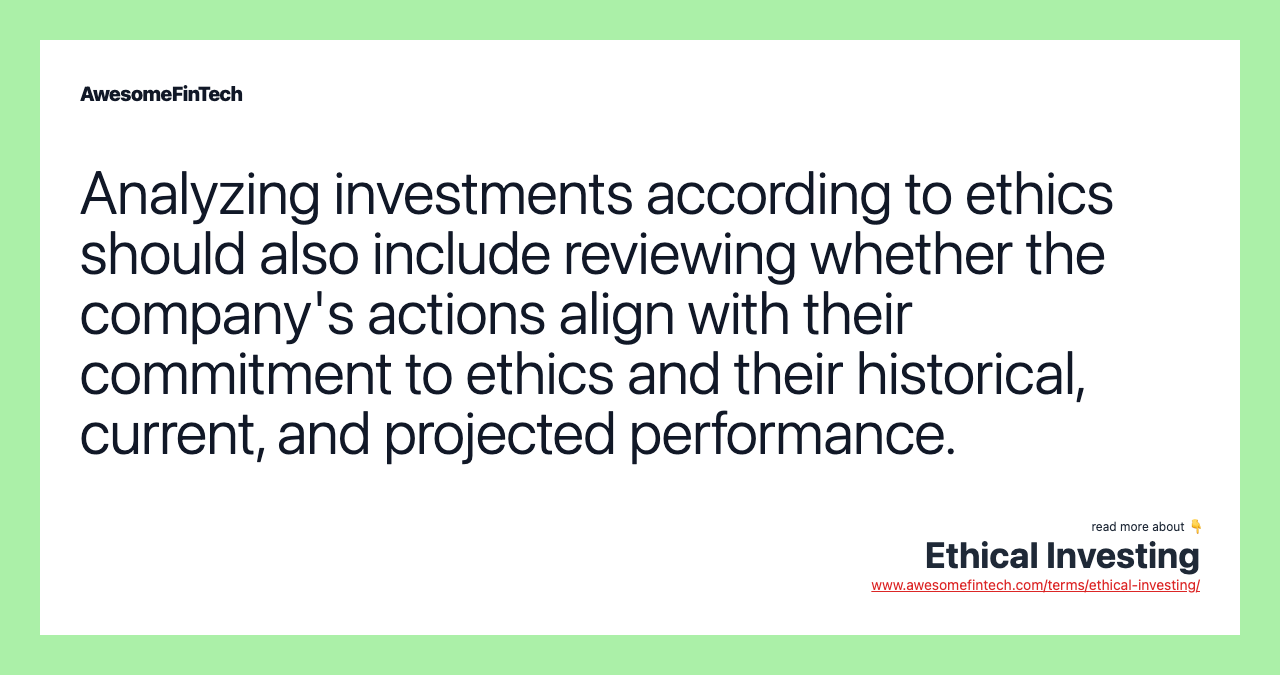 In addition to analyzing investments using ethical standards, the historical, current, and projected performance of the investment should be scrutinized. To examine whether the investment is sound and has the potential to reap significant returns, the review of a company's history and finances is warranted. It is also important to confirm the company's commitment to ethical practices.