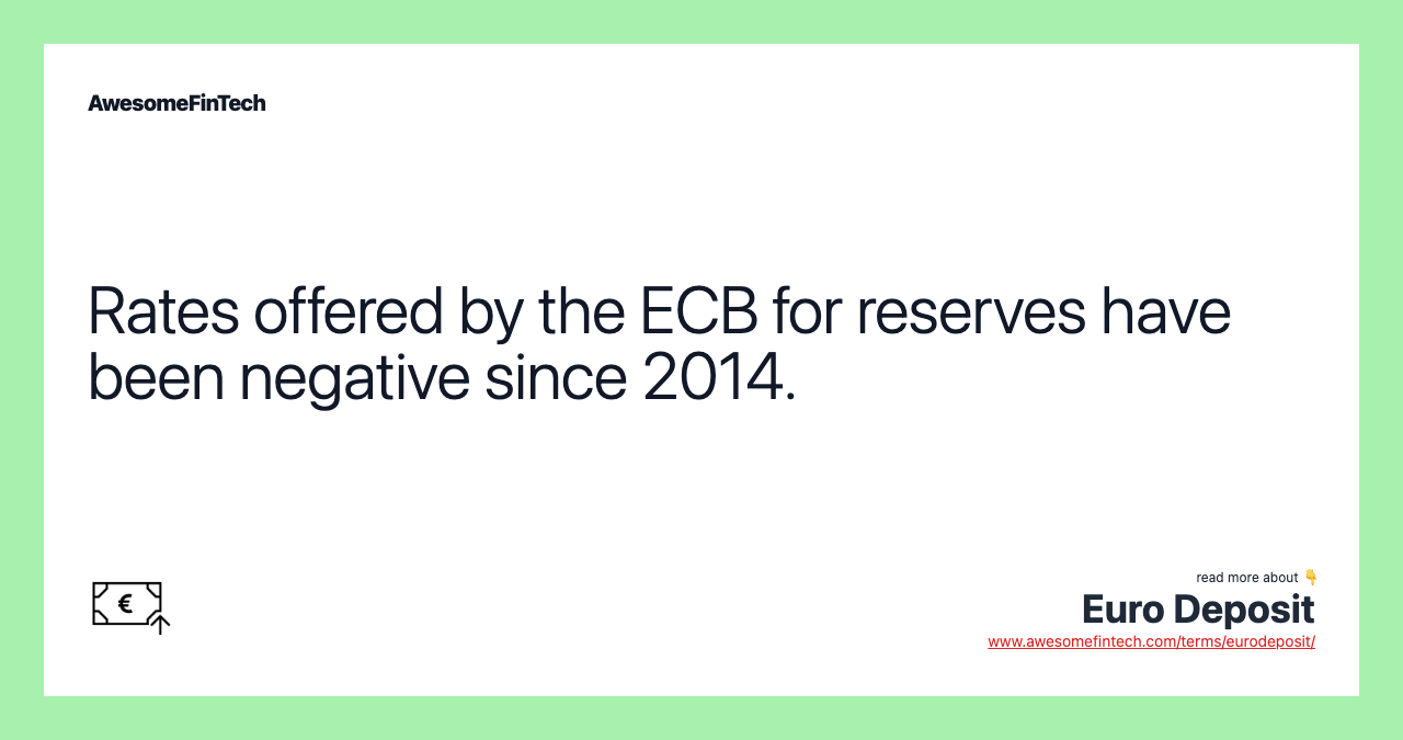 A euro deposit is a deposit of foreign funds into a bank that operates within the European banking system. These banks function on the consolidated European currency — the euro. When an external investor deposits foreign currency into one of these banks, they are effectively depositing in euros. By putting money into a European bank account, the account holder may expect to accrue interest at the floating interest rate determined by the European Central Bank (ECB).