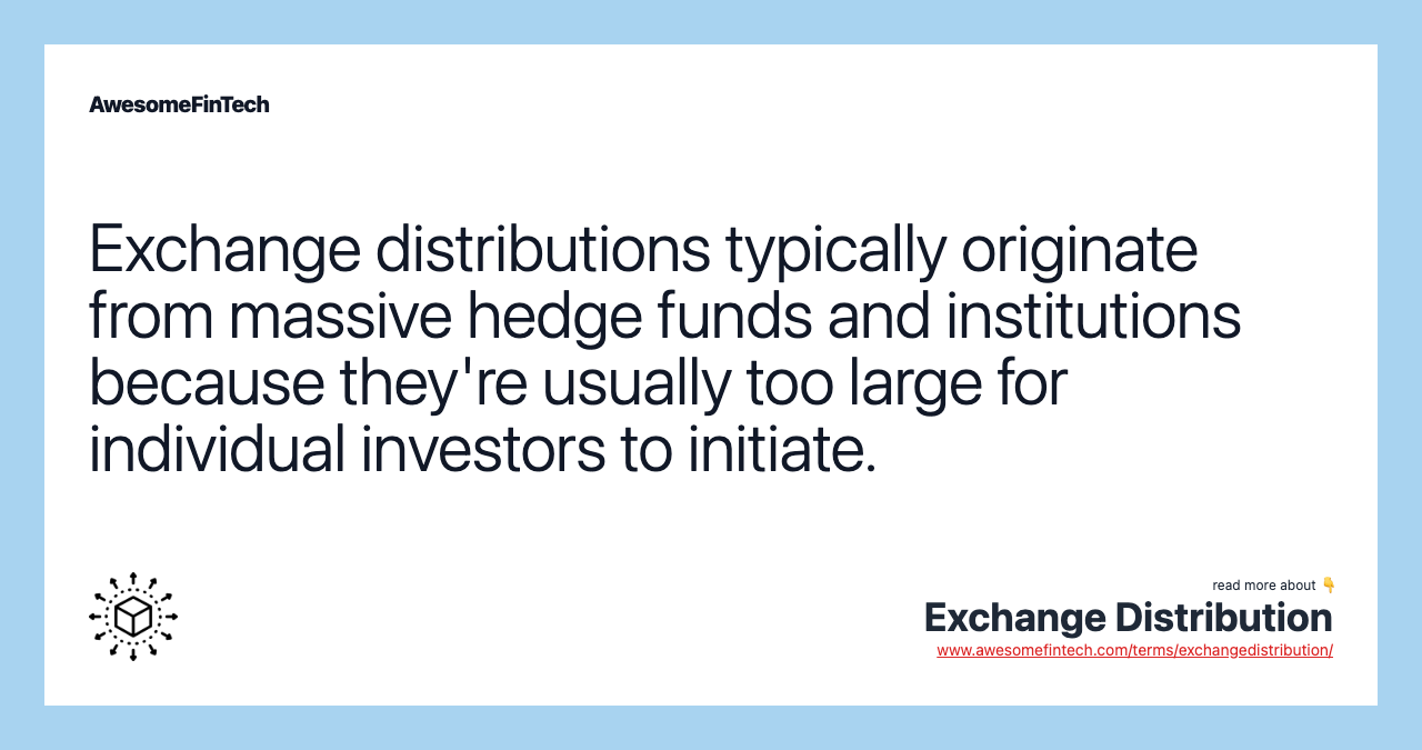 An exchange distribution becomes necessary when an individual or party who holds a significant position in a particular security wants to sell the shares as one transaction rather than splitting the request into multiple trades. The order may be similar in size to a block trade, which may be sold to only one buyer and may not even occur on the open market.