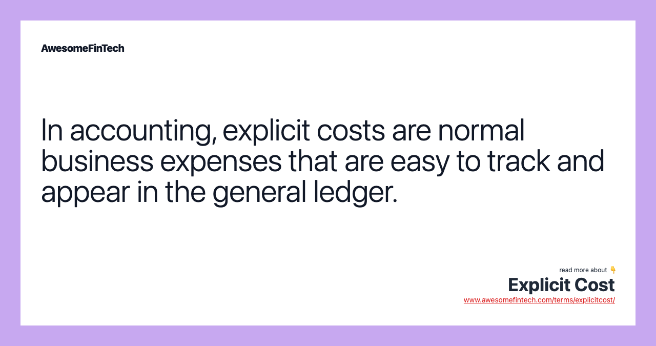Explicit costs are normal business costs that appear in the general ledger and directly affect a company's profitability. Companies use both explicit and implicit costs when calculating a company's economic profit — defined as the total return a company receives based on all costs incurred to attain that revenue. 1:14 Explicit costs — also known as accounting costs — are easy to identify and link to a company's business activities to which the expenses are attributed. Explicit costs are normal business costs that appear in the general ledger and directly affect a company's profitability. Management will utilize explicit costs when reviewing a business's operations, including profits; but will calculate implicit costs only for decisionmaking or choosing between multiple alternatives.