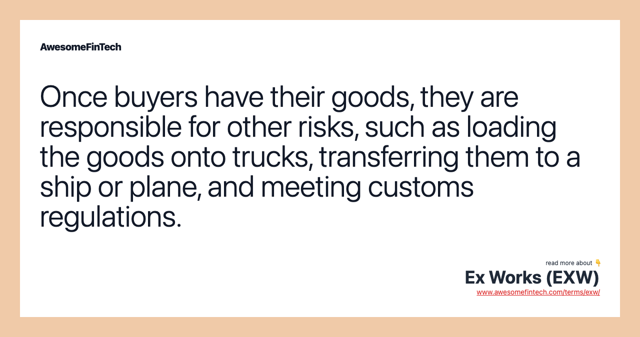 Once the buyer has the goods, it is up to the buyer to cover any expenses and account for any risks that pertain to the goods. Risks could include loading the products onto a truck, transferring them to a ship or plane, dealing with customs officials, unloading them at their destination, and storing or reselling them. Even if the seller helps the buyer by, for example, loading the product onto a ship, it's still up to the buyer to pay up if anything goes wrong during the loading.