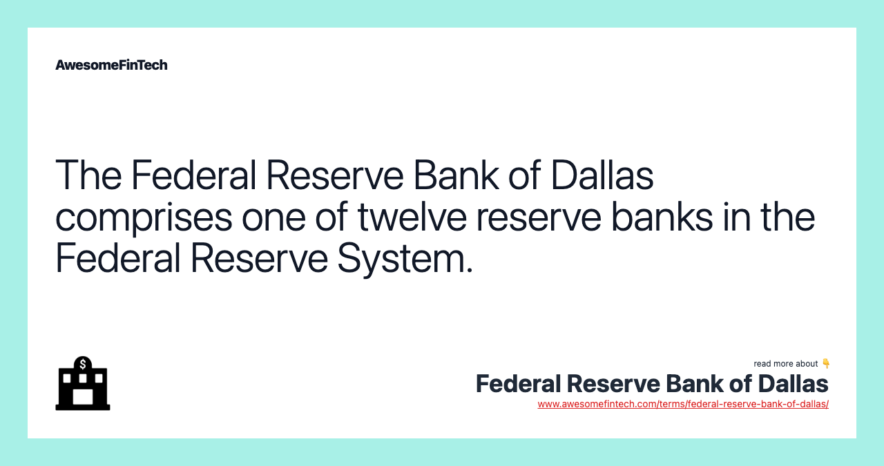 The Federal Reserve Bank of Dallas is one of 12 Federal Reserve Banks, responsible for the Eleventh Federal Reserve District. The president of the Federal Reserve Bank of Dallas is part of a rotation of reserve bank presidents who, along with the seven governors of the Federal Reserve Board and the president of the Federal Reserve Bank of New York, meet to set open market operations. The Federal Reserve Bank of Dallas is one of 12 Federal Reserve Banks, responsible for the Eleventh Federal Reserve District. The Federal Reserve Bank of Dallas comprises one of twelve reserve banks in the Federal Reserve System. The Federal Reserve Bank of Dallas is one of a dozen institutions nationwide whose responsibility is implementing the monetary policy of the Federal Reserve System.