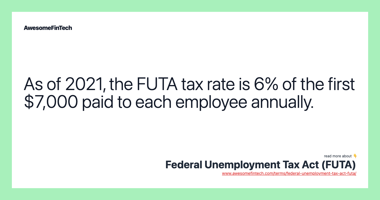 The Federal Unemployment Tax Act (FUTA) is a piece of legislation that imposes a payroll tax on any business with employees. Employers who also pay their state unemployment insurance can receive a federal tax credit of up to 5.4%, resulting in an effective FUTA tax rate of 0.6**%**. Furthermore, payments such as fringe benefits, group term life insurance benefits, and employer contributions to employee retirement accounts are not included in the tax calculation for the federal unemployment tax. The Federal Unemployment Tax Act (FUTA) is legislation that imposes a payroll tax on any business with employees; the revenue raised is used to fund unemployment benefits. In this way, FUTA tax differs from other payroll taxes, such as Social Security tax, which applies to both employers and employees.