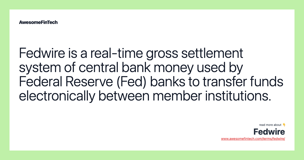 Fedwire refers to a real-time gross settlement system of central bank money used by Federal Reserve (Fed) banks to electronically settle final U.S. dollar payments among member institutions. Fedwire refers to a real-time gross settlement system of central bank money used by Federal Reserve (Fed) banks to electronically settle final U.S. dollar payments among member institutions. Fedwire is a real-time gross settlement system of central bank money used by Federal Reserve (Fed) banks to transfer funds electronically between member institutions. Banks that use the system include depository financial institutions (FI) in the U.S., as well as the American branches of certain foreign banks or government groups, provided they maintain an account with a Fed Bank. The Fed holds accounts for both senders and receivers and settles transactions individually and immediately. The Fedwire system is an electronic funds transfer system used by banks, businesses, and government agencies for large, same-day transactions.